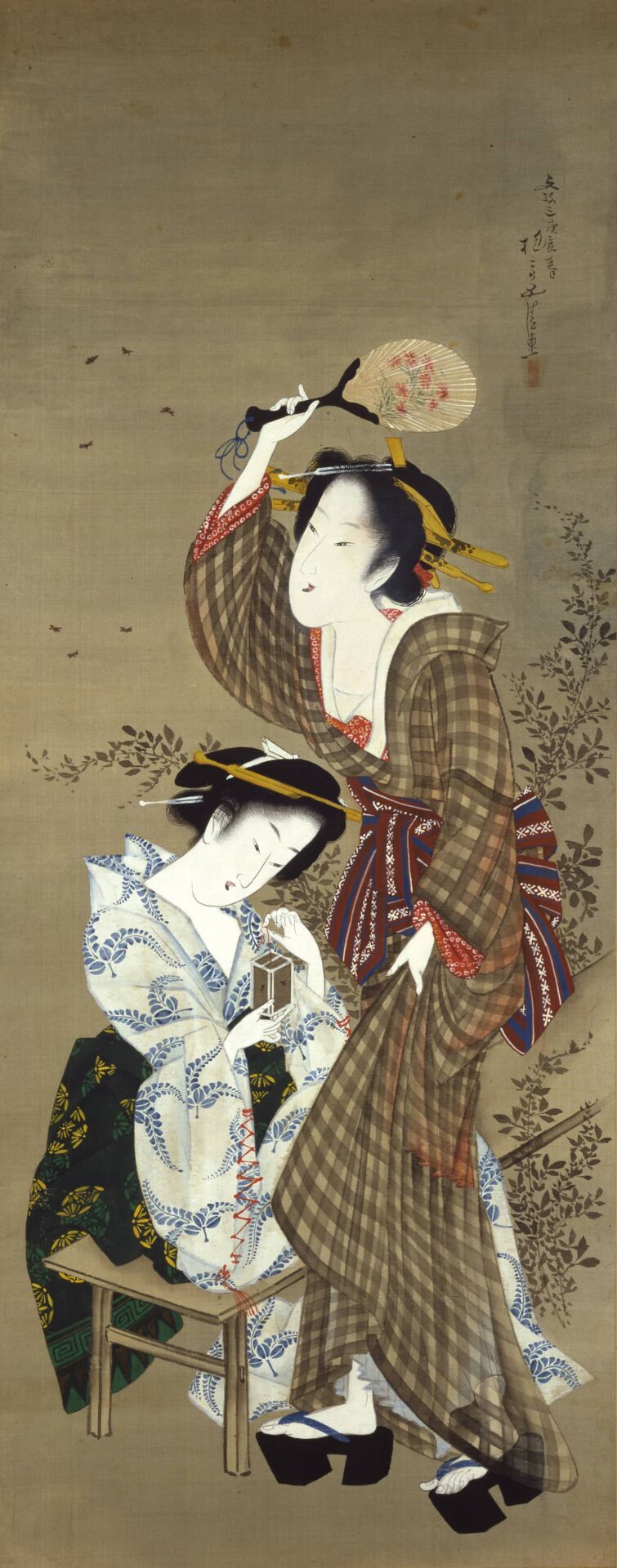 Section two of the gallery features Hokusai’s artwork in reference to his potential visit in his fifties to Suwa, a town famous for its large lake. Although this section features Lake Suwa in Shinano Province, a selection from the aforementioned Thirty-six Views of Mount Fuji, the main attraction is the rarely exhibited Portrait of Chino Hyōgo. This work intimately features portraits of Chino Hyōgo, chief retainer to the Takashima Domain, as well as that of his son, which give further context to Hokusai’s travels during that period of his life.
