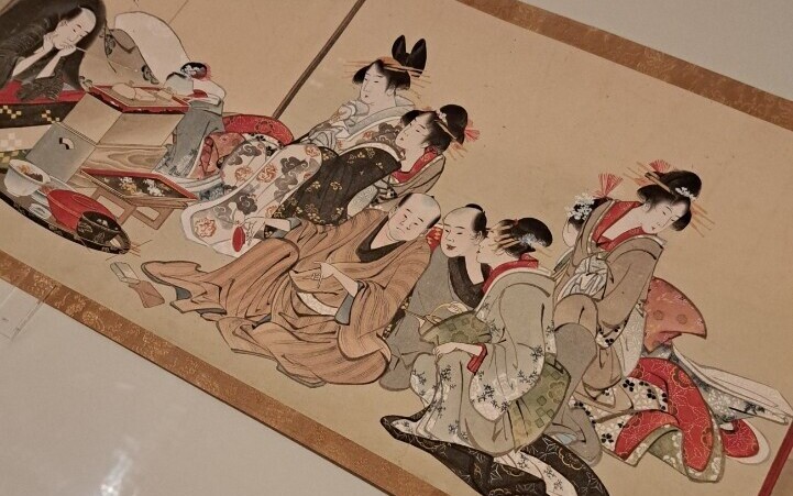 Moving upstairs, the viewer can also experience Hokusai’s more general artistic ventures, such as the vibrant landscapes and delicate nature scenes present in various ukiyo-e print sets including Oceans of Wisdom, A Tour of Waterfalls in Various Provinces,as well as the entire forty-six print collection of the renowned Thirty-six Views of Mount Fuji. This section also features some of Hokusai’s lesser known and unique works, such as hand-painted scrolls, and first edition copies of books featuring Hokusai as an illustrator.