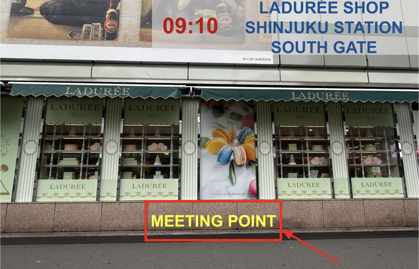 您將在新宿站南門外的拉杜麗馬卡龍店 (LADURÉE Macaron) 附近與導遊會面。南門入口處有許多「Lumine 2」的標誌,您一定能認出它。您將在車站入口正門外的拉杜麗 (LADURÉE) 商店外與導遊會面。請留意手持「Snow Monkey Resorts」標誌的導遊。集合完畢後,我們將一起進入新宿站,開始您的旅程。