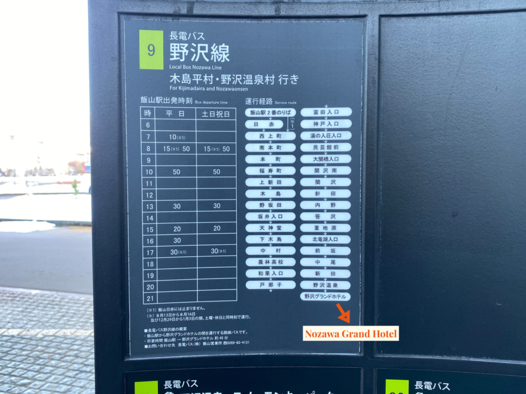 Alternatively, the Nagaden Bus also connects the station to the resort via Kijima – near Kijimadaira Ski Resort – taking just over 40 minutes to reach Nozawa: