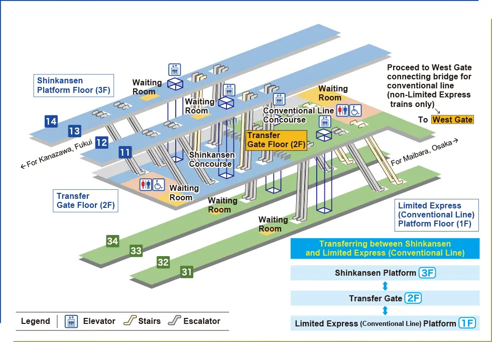 Because Tsuruga Station is small, it is very easy to get to your train transfer in time. If you're coming from Kyoto, simply follow the signs to the Shinkansen Platform on the third floor (3F). If you're coming from Fukui, Kanazawa or Toyama, head down to the first floor (1F).