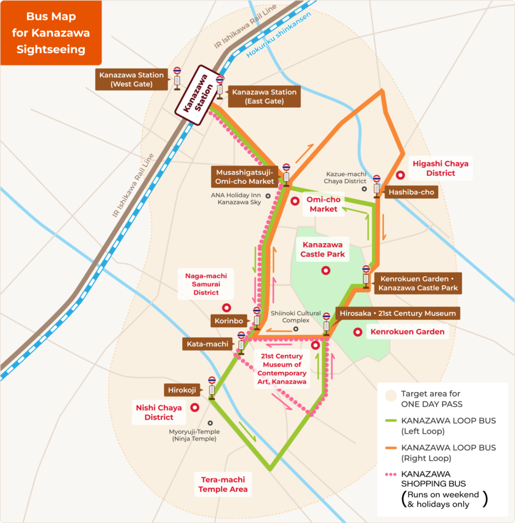 The Right Loop, shown in orange above, turns left at Omicho Market, there are stops at the Higashi Chaya Tea District, Kenrokuen Garden, 21st Century Museum of Modern Art, Korinbo Shopping District, and Omicho Market before terminating at Kanazawa Station.