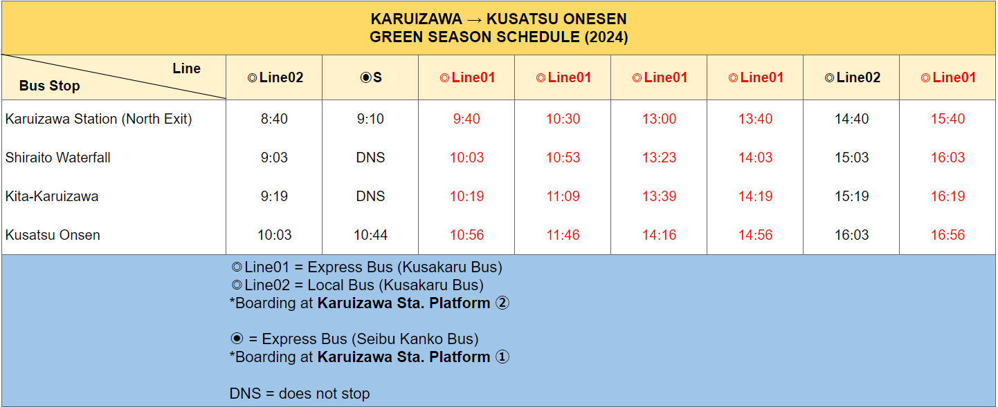 For visitors heading to Kusatsu Onsen, six daily services take around 80 minutes / JPY2240 one-way. The following timetable operates daily: