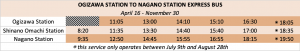 For many visitors, accessing Ogizawa Station will be most easily undertaken from Nagano Station. As a stop on the Hokuriku Shinkansen line running from Tokyo to Kanazawa, Nagano is readily accessible from other major cities. At Nagano Station, buses to Ogizawa Station depart from Bus Stop No.25 outside the East Exit. The journey takes approximately 105 minutes with following schedule operating daily from Nagano Station: