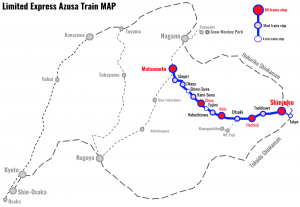 *Please note, stations marked in bold / red on the map are stops on all services. Those not marked in bold are only serviced by certain services throughout the day. Some services extend to stop prior to Shinjuku Station – including Chiba – Funabashi – Kinshicho / Tokyo – and after Matsumoto Station – including Toyoshina – Hotaka – Shinano-Omachi – Hakuba – Minami-Otari.