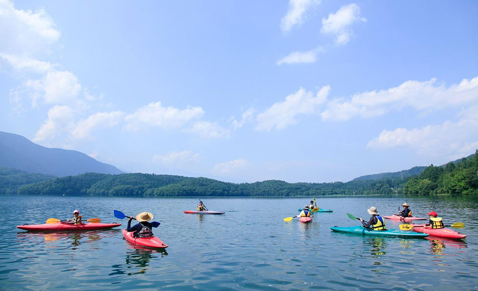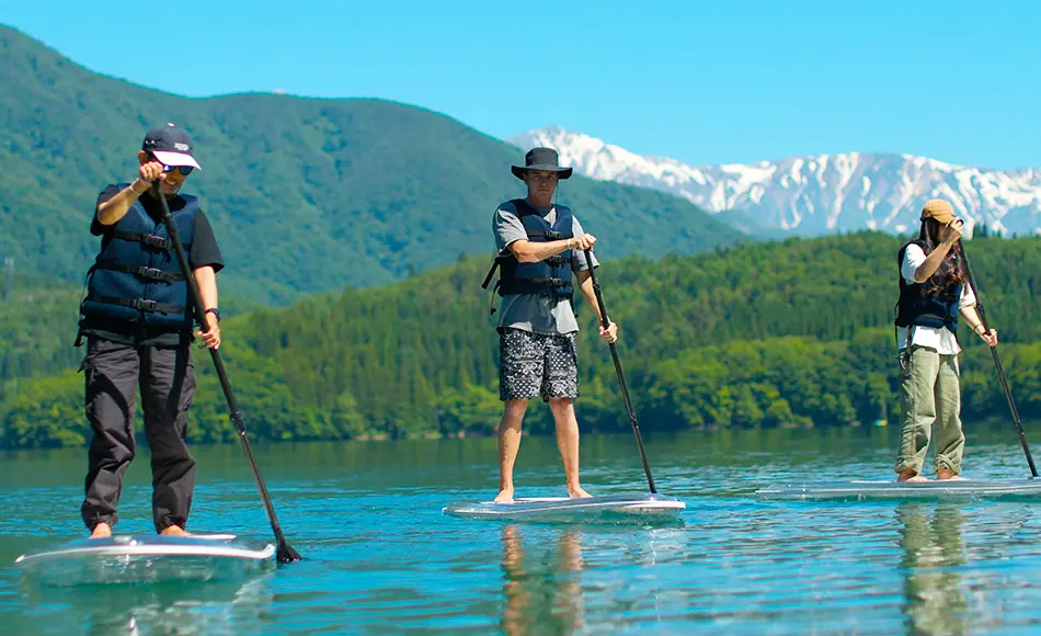Lake Aoki is a large lake in the Hakuba area, and perfect for summer activities! You can enjoy SUP (stand-up paddleboarding), kayaking, and canoeing in this pristine alpine lake. In addition to regular SUP and kayaks, there are also unique clear ones available for rent. You can even bring your dog along for the ride!