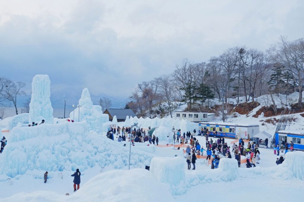 During winter, the snow-covered landscape transforms the area into a peaceful retreat, highlighted by the Ice Festival and steaming onsen.
