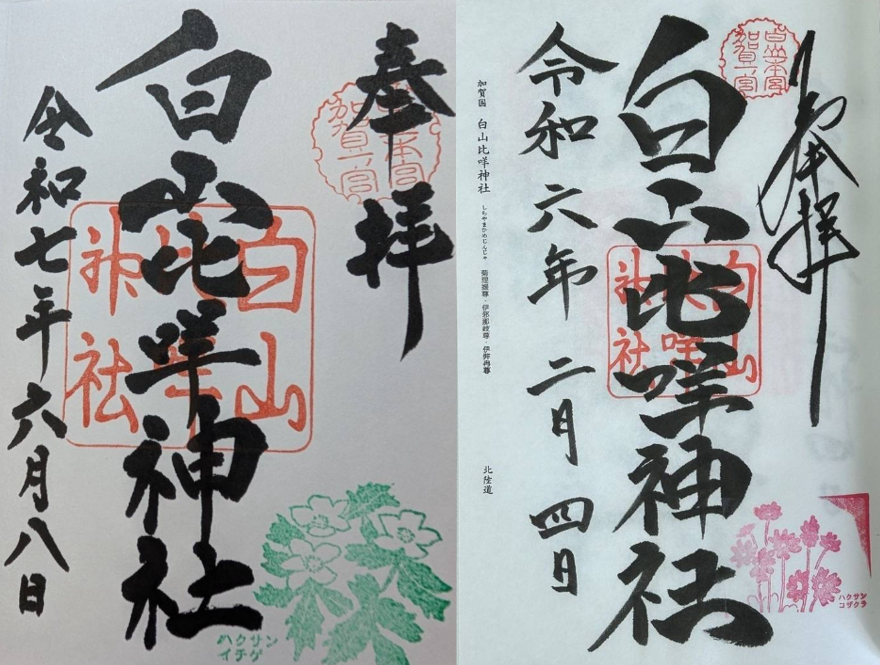 While Shirayama Hime usually doesn't offer seasonal or special event goshuin, it does use a seasonal stamp. Shown left is anemone, used in June. Shown right is the wedgeleaf primrose, local to the area and called hakusan kozakura.