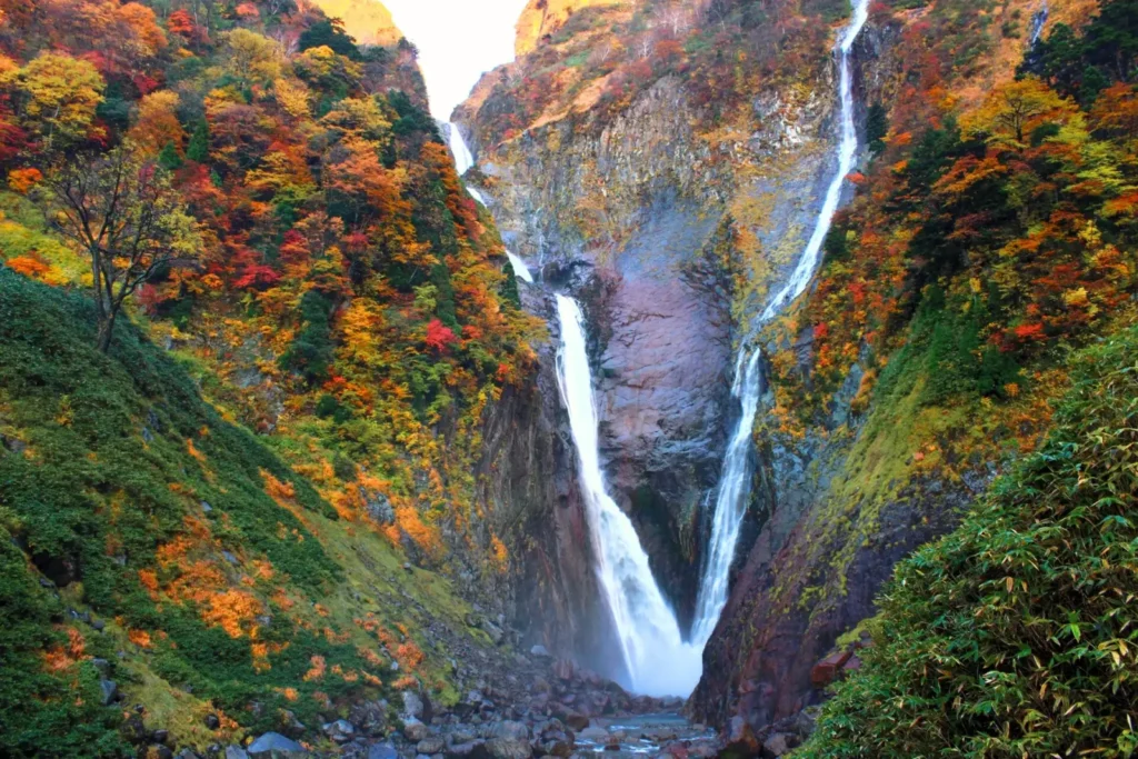 Shomyo Falls is at its most spectacular in spring as melting snow above send huge amounts of water cascading down; enough to generate a twin waterfall – Hannoki Falls – for a period of time. Come autumn, the gorge and forest surrounding the falls turn red, gold, and orange – a truly beautiful sight and one worth stopping for.