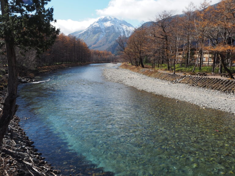 Hiking trails span out along the valley floor and follow the river as it meanders north to south before more advanced hiking and climbing routes ascend to the mountains above. Known as one of Japan’s most spectacular natural landscapes, access to Kamikochi is controlled to preserve its pristine character and important ecosystems, including wetlands, ponds, and the sparkling Azusa River which flows down from Mt. Hotaka to feed the world below.