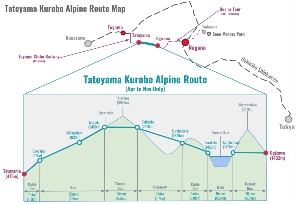 The following summary lists the transports used during your journey, provided in the order of visitors travelling from Nagano/Ogizawa to Toyama/Tateyama. The journey can also be made in reverse: