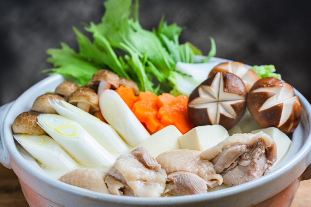 Hikizuri Nabe is made by simmering vegetables in a sweet and savory broth, then dragging bite size pieces of chicken across the bottom of the pot, hence the name “hikiuri” which means “dragging” in Japanese.