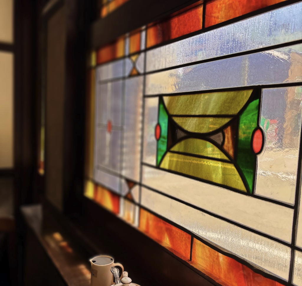 Inside, antique furnishings, stained glass, and a small cozy counter create a nostalgic and intimate atmosphere.
