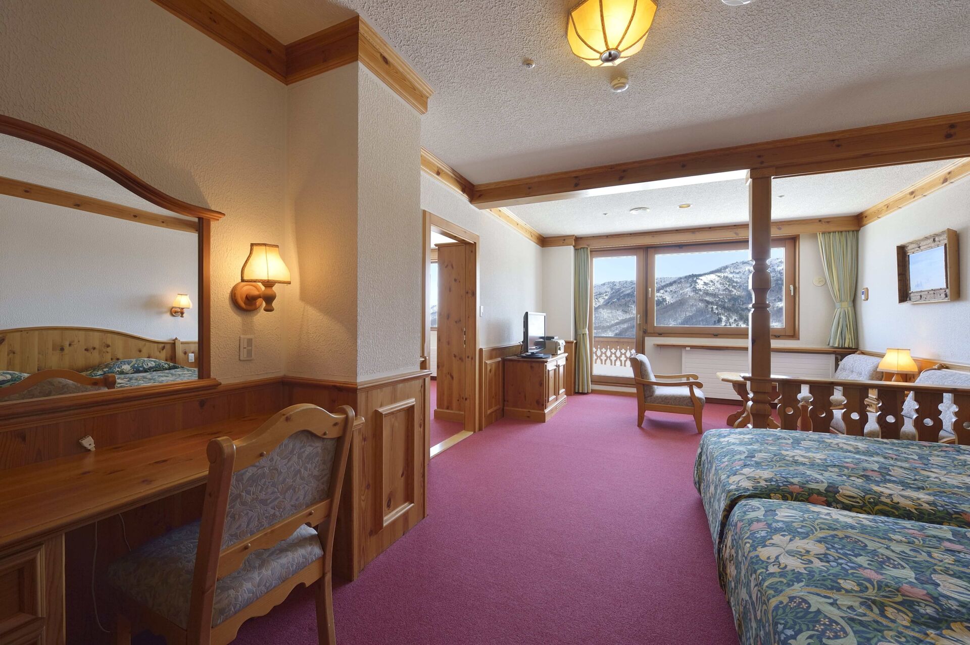 Each room is 42㎡ in size and built with a plenty of natural wood. Every furniture in the room is harmonized in a quiet color tone. Its bathroom is equipped with twin dressing tables and sinks so that you could use it in a relaxed manner.