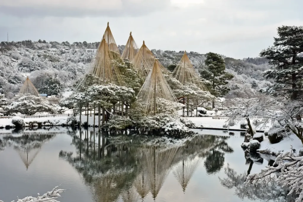 Kenrokuen is one of Japan's finest gardens. Throughout winter it transforms into a picturesque snowscape. To help protect their fragile branches from the heavy snow, trees are held upright with special ropes called yukitsuri. These trees cut striking silhouettes against the sheer white of the snow and reflect beautifully on the still water of the garden's ponds.