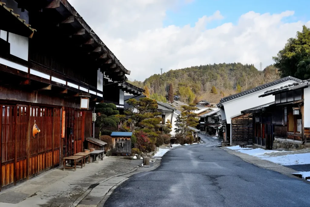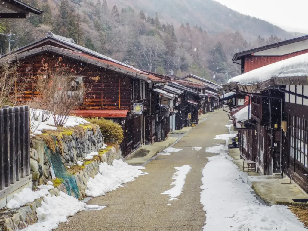 Narai-juku / Kiso-Fukushima – Narai-juku, often called the “1,000 inn town,” offers a longer stretch of preserved post-town architecture with a few ryokan that stay open through winter. The town is particularly atmospheric when dusted with snow, and its quiet wooden facades glow softly under street lanterns in the evening. Kiso-Fukushima, about 20 minutes away by train, is a practical and comfortable base with a wider range of hotels and guesthouses. It also offers onsen facilities — perfect after a cold day outdoors — and easy access to transport and restaurants.