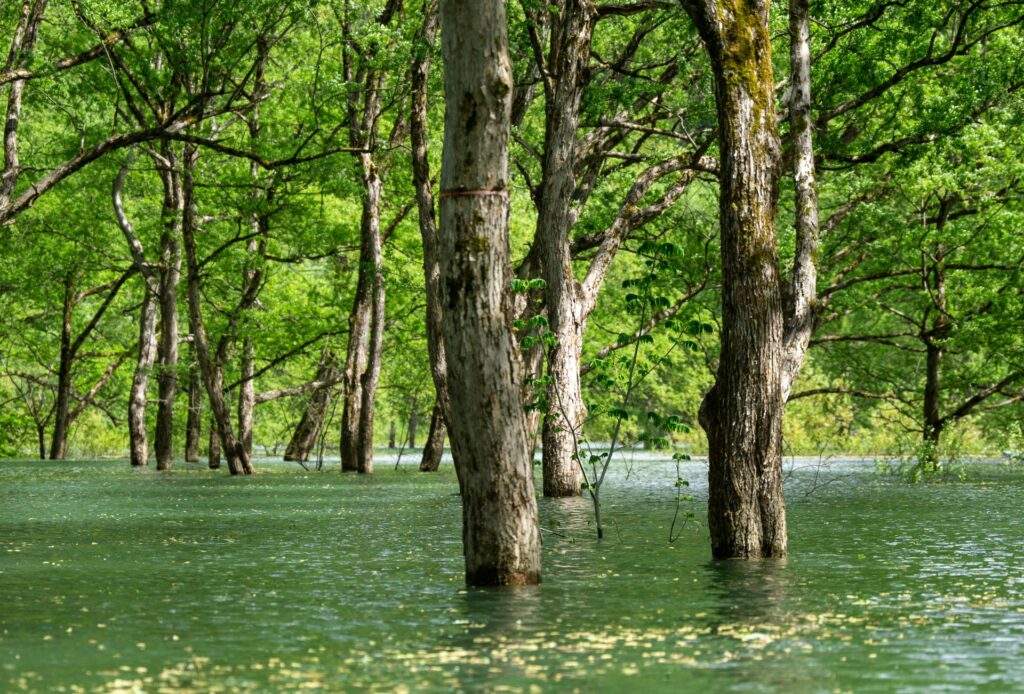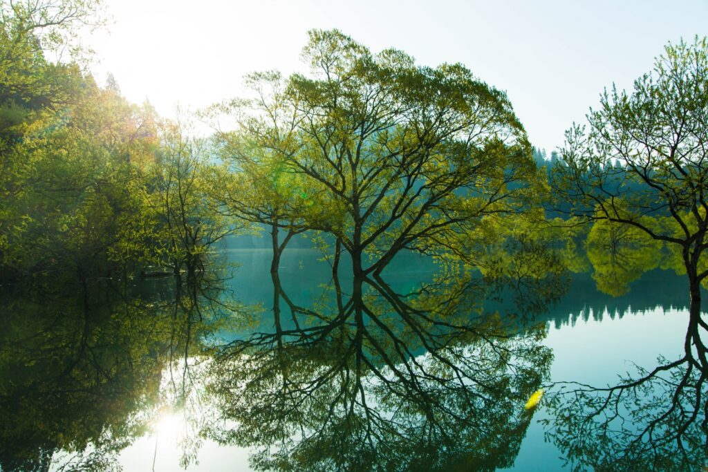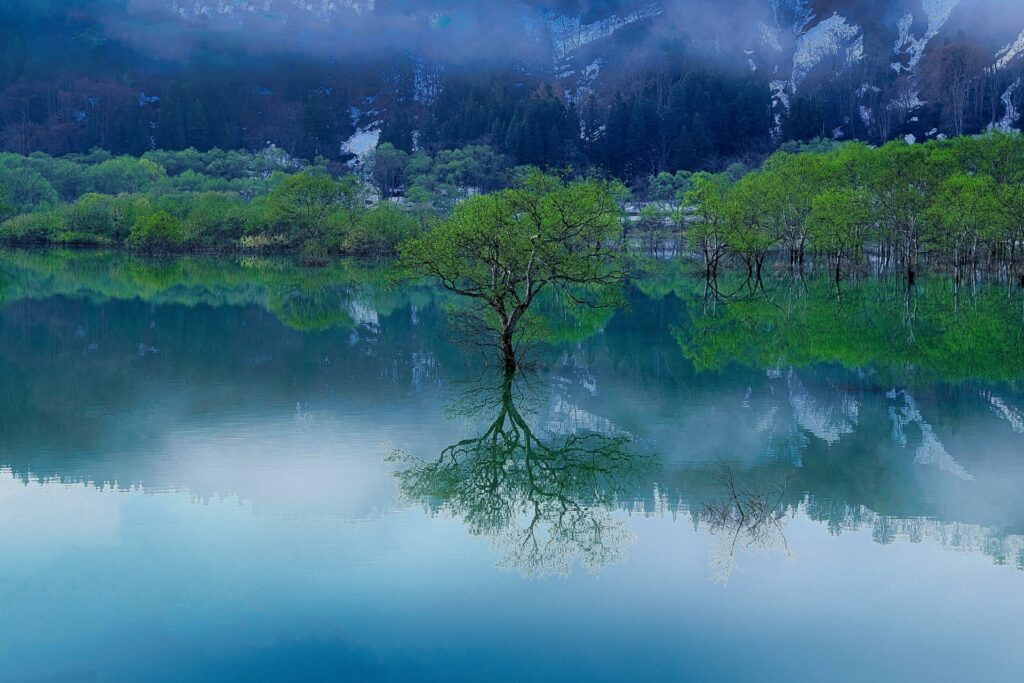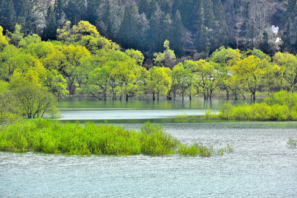 Shirakawa Lake in Yamagata prefecture gives a fantastic, but very limited, sight from late March to late May. Thanks to the heavy amounts of snowmelt from the mountains, the water levels in the lake rise significantly. This creates a magical view of reflected trees that appear to be floating just above the water line. On particularly clear and windless days, the clear reflection is truly breathtaking.