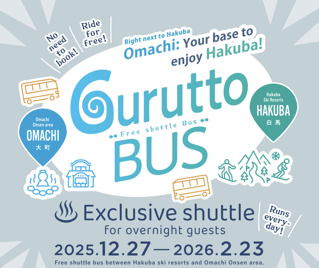 The shuttles include the free “Gurutto Bus” connecting Hakuba and Omachi, as well as the paid Hakuba Valley Shuttle (free for Season Pass and Day Pass holders), operating according to the timetables below: