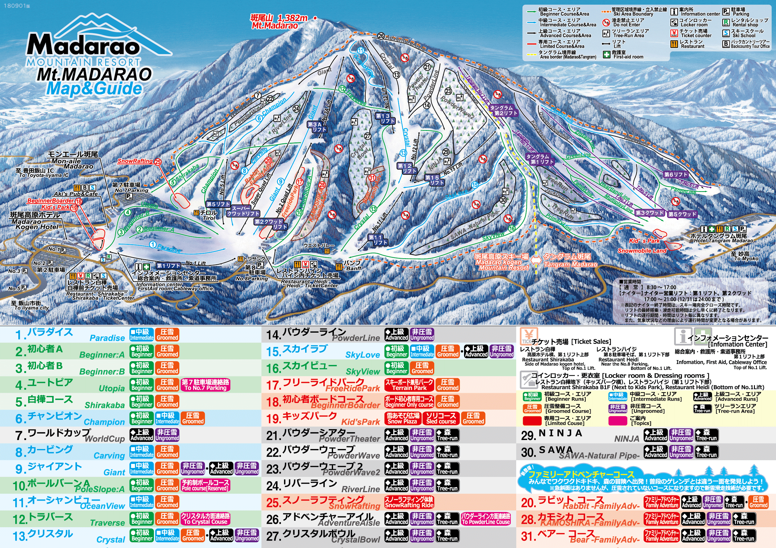 Given Madarao’s low elevation it tends to have a shorter season than other Nagano resorts however the entire resort will generally open and close at the same time (unlike some other resorts that lengthen their seasons with partial openings) and when the snow is good, it’s great meaning that it has lots of fans. The natural bowl shape of the resort means that the powder piles up and when you combine that with some truly excellent tree zones and backcountry, Madarao has plenty to offer. The resort connects to Tangram Ski Circus via the upper ‘Adventure Aisle’ course, combining to offer a good-sized area of terrain covered by an all-mountain pass.