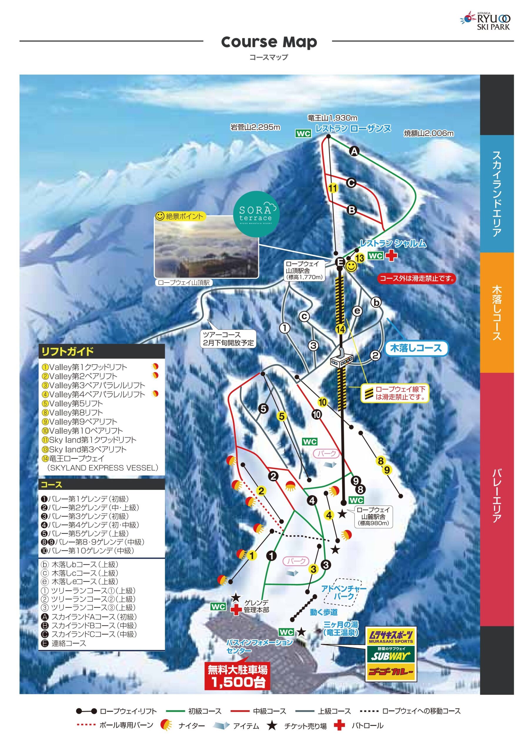 For international visitors, only Ryuoo and X-Jam Takaifuji stand-out as appealing. Ryuoo is the largest of the four, a long resort serviced by a ropeway capable of carrying up to 166 passengers. The resort sits between 850 to 1930 metres, offering an excellent 1080 metres of vertical. A total of 17 ski runs are serviced by 9 chairlifts and the ropeway – totalling around 100ha of terrain. Popular with local snowboarders and university students, the upper areas of the resort can have some fantastic powder and sidecountry. Add to that a couple of terrain parks, Ryuoo has enough to offer but avoid weekends and holidays when university students take advantage of package deals and tend to sit all over the runs, to the frustration of anyone other than newbies.