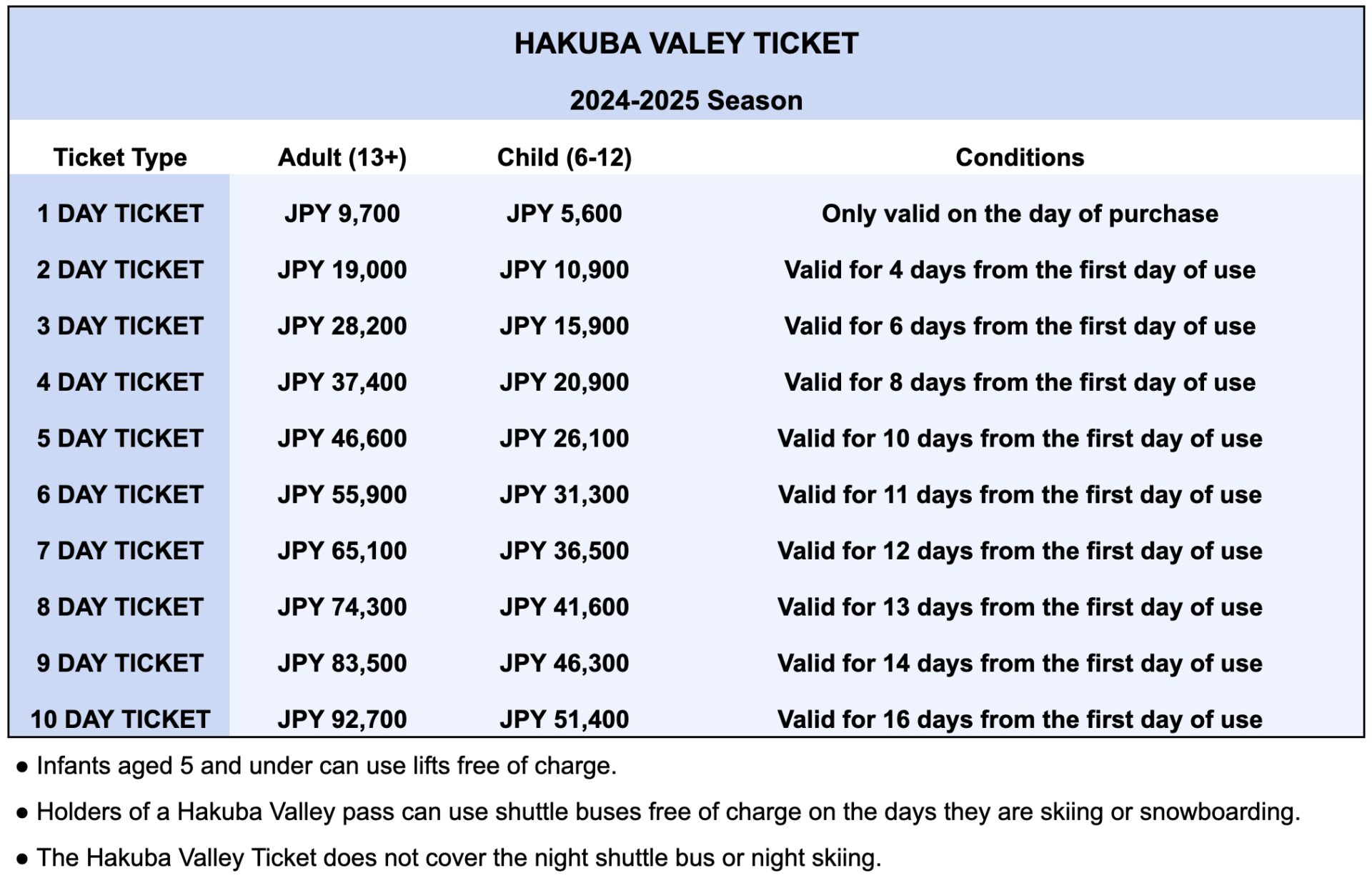 Tickets can be purchased for any window/counter selling lift-tickets anywhere in the Hakuba Valley. For visitors wanting to enjoy more than one resort and/or staying for an extended period, the ticket is great value for money and saves the hassle of purchasing a new pass each day.