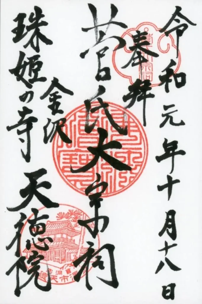 Situated near the west coast of Japan is Kanazawa, a veritable treasure trove for goshuin hunters. This city was left completely undamaged during World War 2 so much of its rich history has been preserved. The former lords of Kanazawa, the Maeda Clan, were also massive patrons of the arts and crafts. Many of these still survive today and manifest themselves in a variety of ways, including in many of the goshuin stamps.