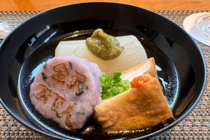 Oden is a type of stew often eaten in winter. While the actual ingredients will differ quite a lot from place to place, it usually consists of seafood, tofu, eggs and vegetables boiled in a kelp-based broth. As Kanazawa can get quite cold in the winter, oden is a popular dish to chase away the chill after a long day in the snow.