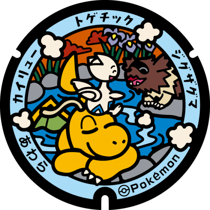 Awara Onsen town has one of the best PokeLids in the prefecture, featuring Dragonite, Togetic and Zigzagoon enjoying a relaxing bath in the hot springs. Togetic is an egg so, obviously, can't enter the water, so it's enjoying playing with Zigzagoon instead.