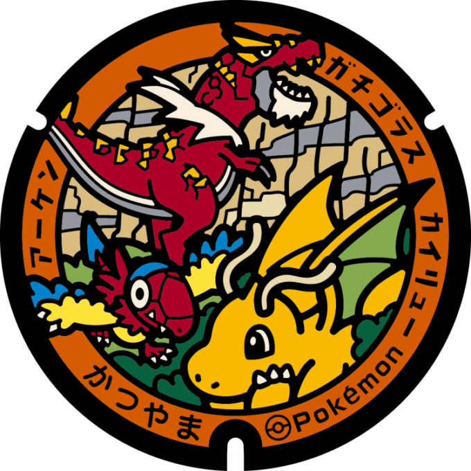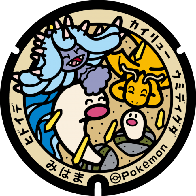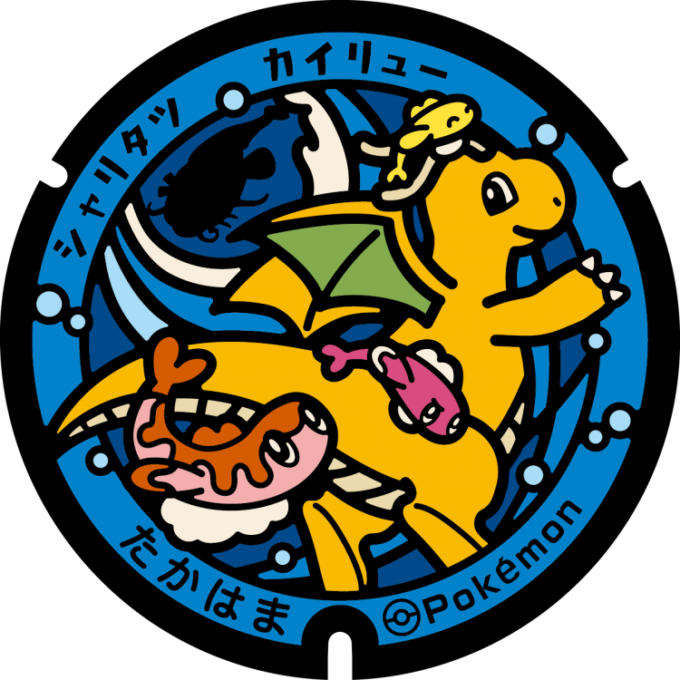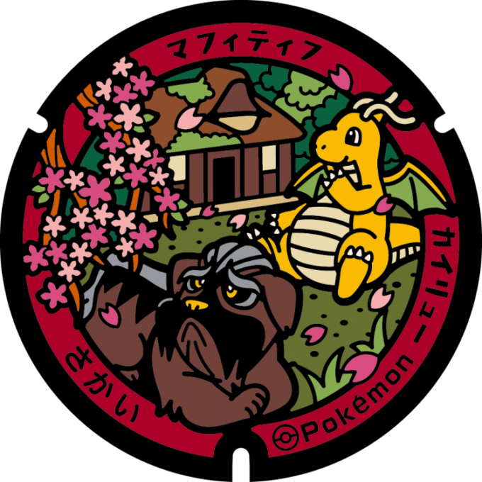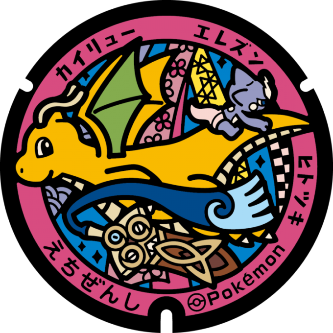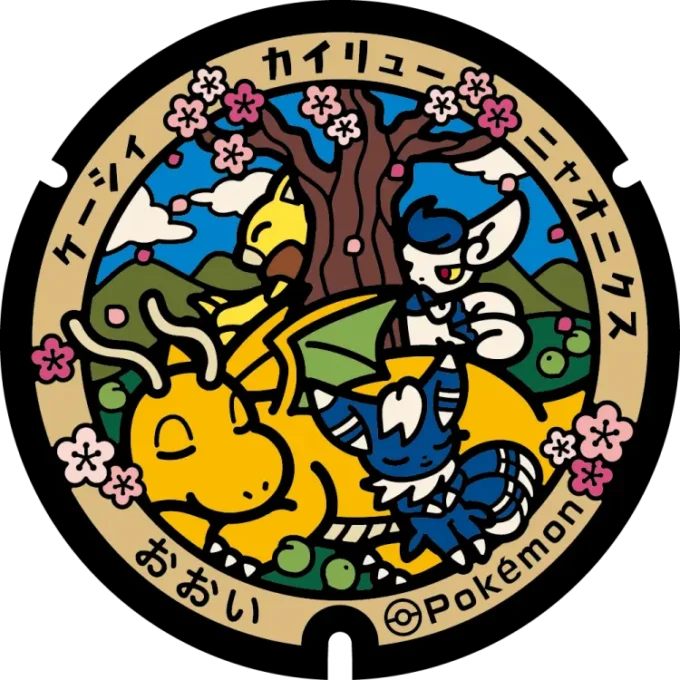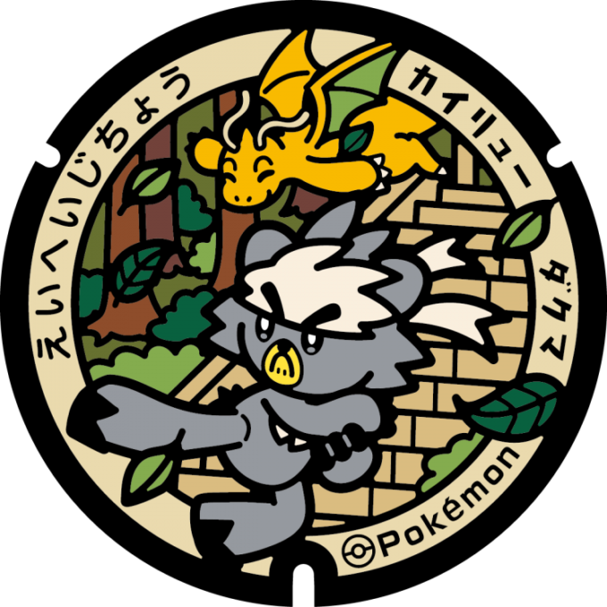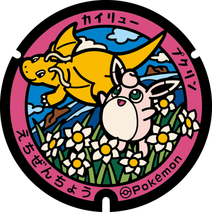 This manhole cover for the small town of Ikeda features all three of the Dragonite evolution line. Dragonite carries Dratini and is giving Dragonair a piggyback as it flies up the Ryuuso waterfall. The falls once had a pool so deep that the bottom was hidden, although only a shallow one can be seen today. Local legends say that a dragon lived there and would ascend the falls to reach the heavens.