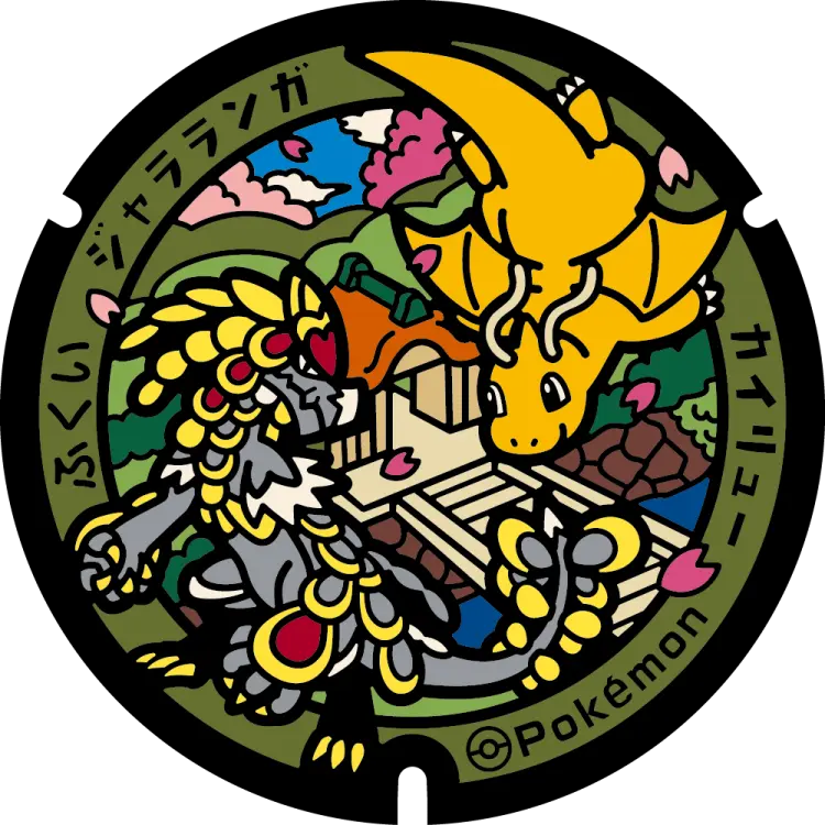 Echizen Town's PokeLid depicts Dragonite and Wigglytuff in a field of daffodils near the sea. The PokeLid itself is located in Echizen Town's craft village. This town was once a bustling hub of craftsmen, making pottery, lacquerware, paper, steelworks, and bamboo art. Centuries ago, war displaced many of the craftsmen and the continued financial decline of Fukui led them to pursuing their trade elsewhere. Many stayed, though, and their descendants still work in this town with some using techniques dating back more than 1000 years.