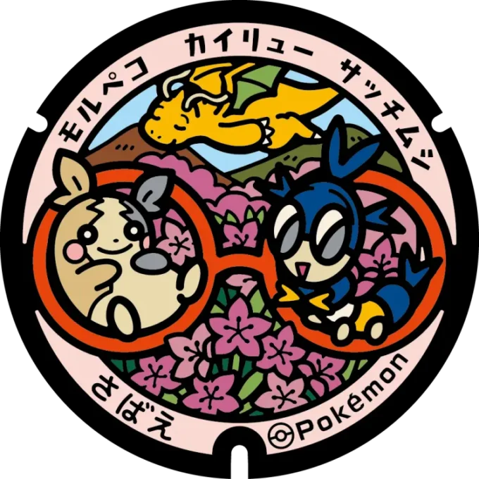 In Sabae, we find a PokeLid featuring Dragonite in the upper center, Morpeko on the left and Blipbug on the right. Morpeko and Blipbug are sitting in a pair of spectacles, referencing Sabae's status as the leading manufacturer of glasses' lenses in Japan. In fact, around 90% of all eyeglass lenses are made here. Frames and textiles, too, are made in abundance.