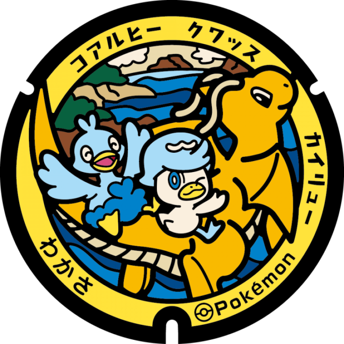 The traditional village of Wakasa is one of the smallest areas on this list. Their PokeLid features Dragonite soaring over the Mikata Five Lakes with Quaxley and Ducklett on its back. Unsurprisingly, ducks can often be found in the rivers and ponds near Wakasa.