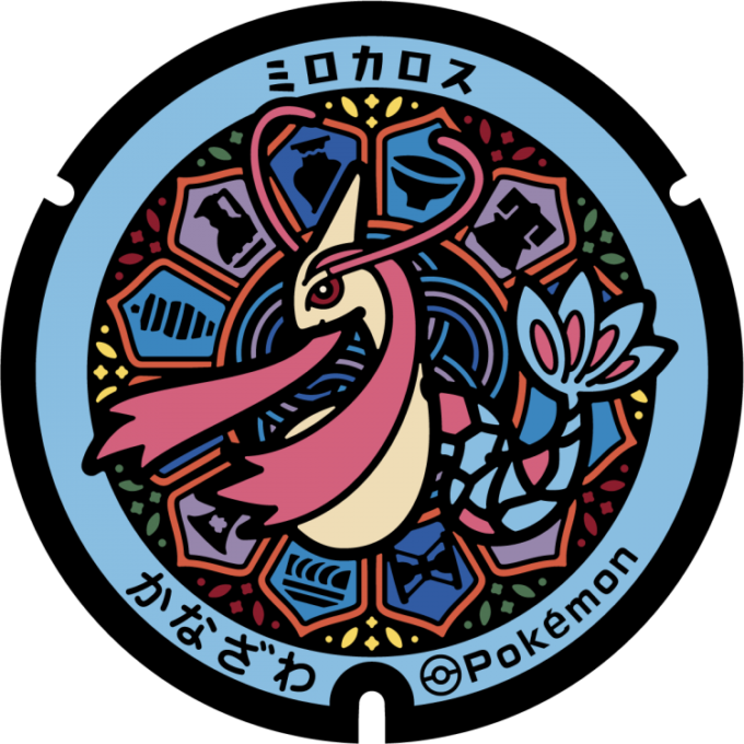The PokeLid again references Milotic and Kanazawa's beauty. The background depicts different porcelain objects which is a reference again to Kanazawa's variety of traditional crafts. In the centre behind Milotic is a knot of mizuhiki, a type of decorative art made of paper string. Finally, the colours around the edge of the picture are a reference to Kanazawa's visually-distinct seasonal changes, as the city is said to wear a new face every time the season changes.