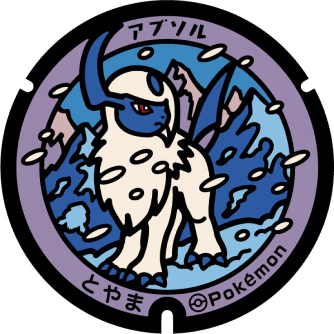 The farthest from Toyama Station of the three Toyama PokeLids is also the best. The PokeLid in Toyama City Butaigeijustsu Park depicts Absol atop Tateyama Mountain in the midst of the snow.