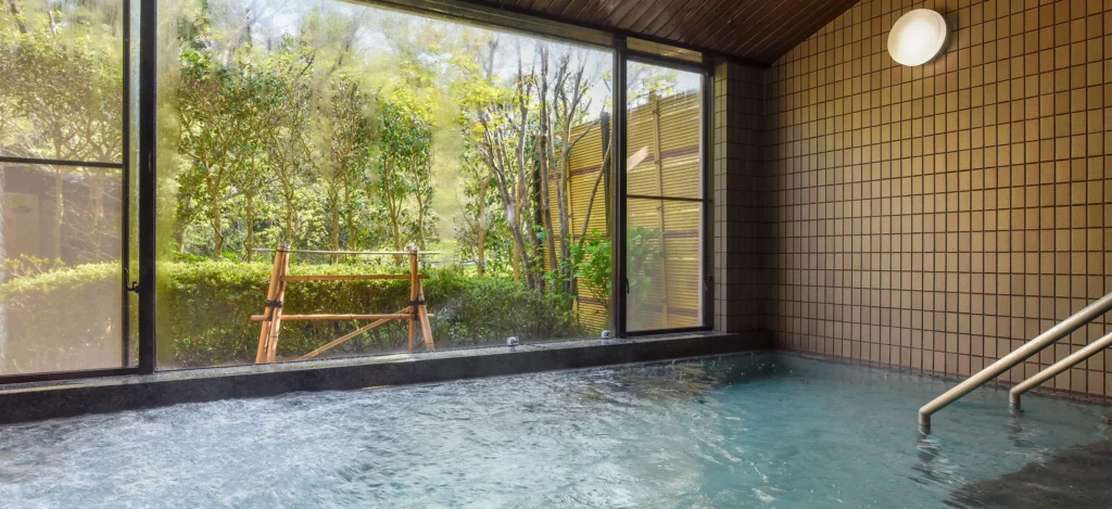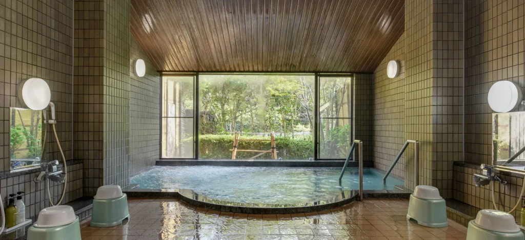 The distinct tiled walls on each side of the bath were made of kutaniyaki, a traditional type of porcelain craft unique to the Kanazawa region. Kutaniyaki is known for its bright and colourful designs. There is also a sauna room, cold bath and outdoor terrace bath.