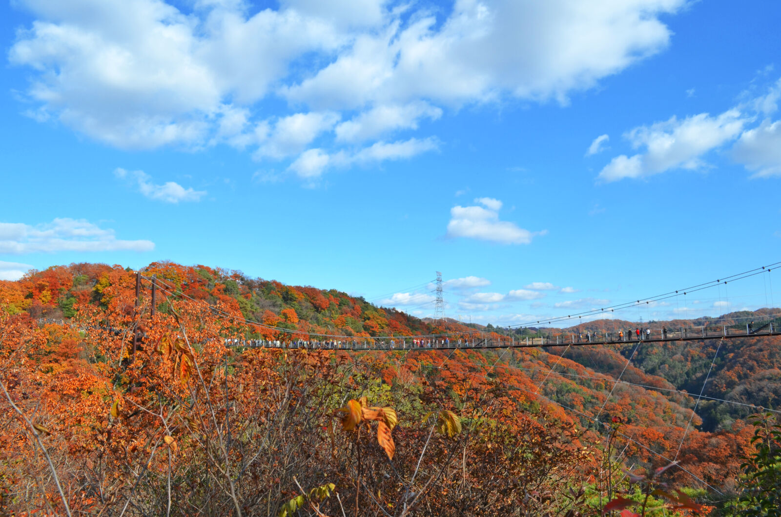 For an adventurous take on autumn leaves, head to Hoshida Park. The star attraction is the Hoshi no Buranko, a 280-meter-long suspension bridge that swings high above a forested valley. In autumn, the canopy below bursts into red, orange, and yellow, offering a panoramic view you can’t get anywhere else.