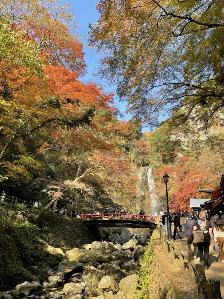 Just 30 minutes north of central Osaka, Minoh Park is one of Kansai’s most famous autumn leaf destinations. A scenic 2.8 km walking trail winds along a forested river valley, ending at the 33-meter-high Minoh Waterfall. When the maples surrounding the waterfall turn bright crimson, the scene feels almost painterly.