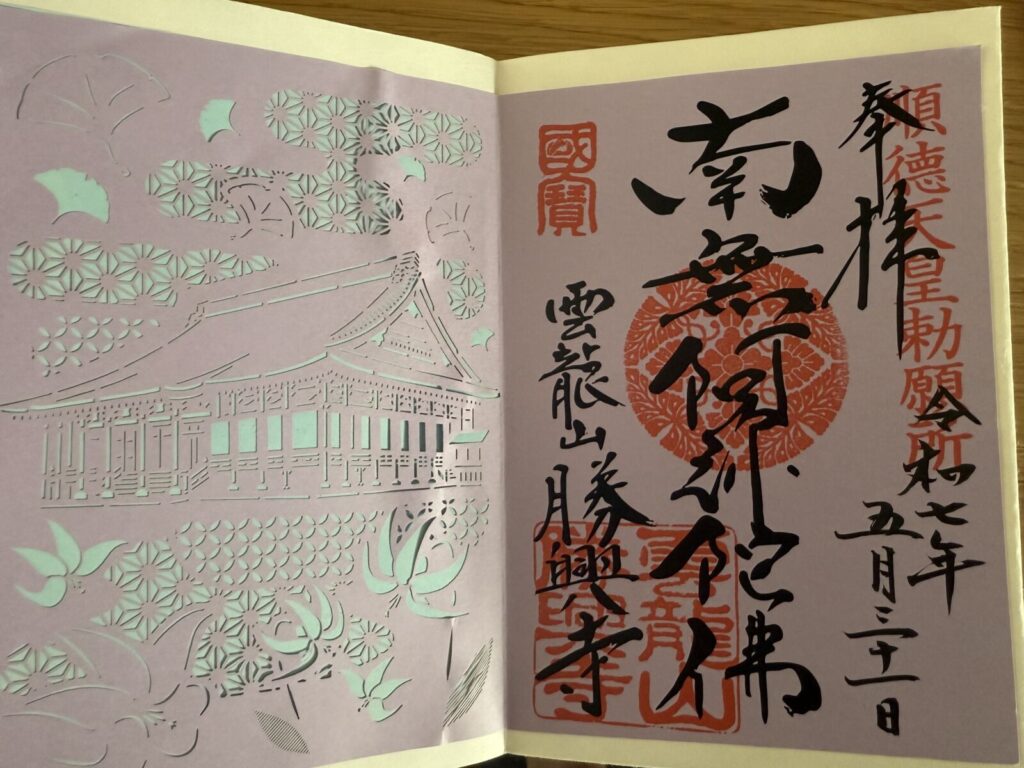 The accordion-style binding allows multiple pages to be viewed at once. When goshuin were collected as part of a pilgrimage, it also meant that the dates could be easily inspected and compared.