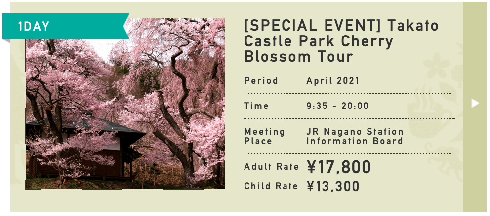 Operating all year round, we are Nagano’s No.1-rated tour and charter operator and come each spring, we are happy to offer two group tours that transport guests to some of the region’s best blossom-viewing spots! Both tours start and finish at Nagano Station, allowing guests to join us on the day from Tokyo, and should you wish to, return to there at the end of the day. Tour start and end times are coordinated to match shinkansen times operating to and from Nagano from the capital.
