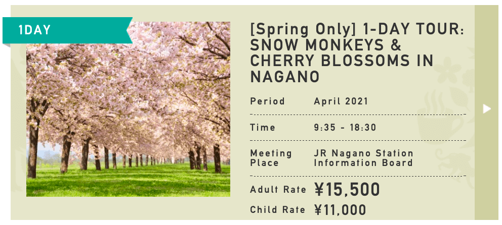 Through April, our 1-Day Snow Monkeys & Cherry Blossoms in Nagano Tour is one of our most popular! Combining a visit to the Jigokudani Monkey Park with lunch and afternoon of blossom-viewing, this tour captures the essence of Nagano in spring. Afternoon blossom-viewing spots are chosen based on where the flowers are at their best on the day and cannot therefore be confirmed prior to the tour. But rest assured, we do this to ensure our guests have the best possible experience on the day and plenty of the spots mentioned above - plus a couple of secret ones! - are on the list of possible sites.