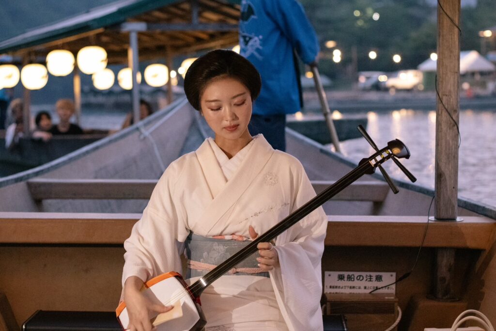 Our day concludes on the river itself. A private boat awaits on the Katsura, where a former maiko (geisha apprentice) named Kohaku welcomes us with music and stories. The shamisen, a three-stringed instrument at the heart of geisha entertainment, provides the soundtrack as the boat drifts along the water. Kohaku trained in Kyoto’s traditional performing arts from the age of sixteen, and her perspective offers guests a rare behind-the-scenes glimpse into the world of maiko and geisha—a cultural sphere usually closed to outsiders. She shares the nuances of dress, makeup, dance, and the long path of training that leads from maiko to geisha, while also inviting guests into the lighter side of geisha culture. Laughter fills the boat as she teaches traditional party games such as konpira fune fune, in which quick reflexes and rhythm are tested in playful competition.