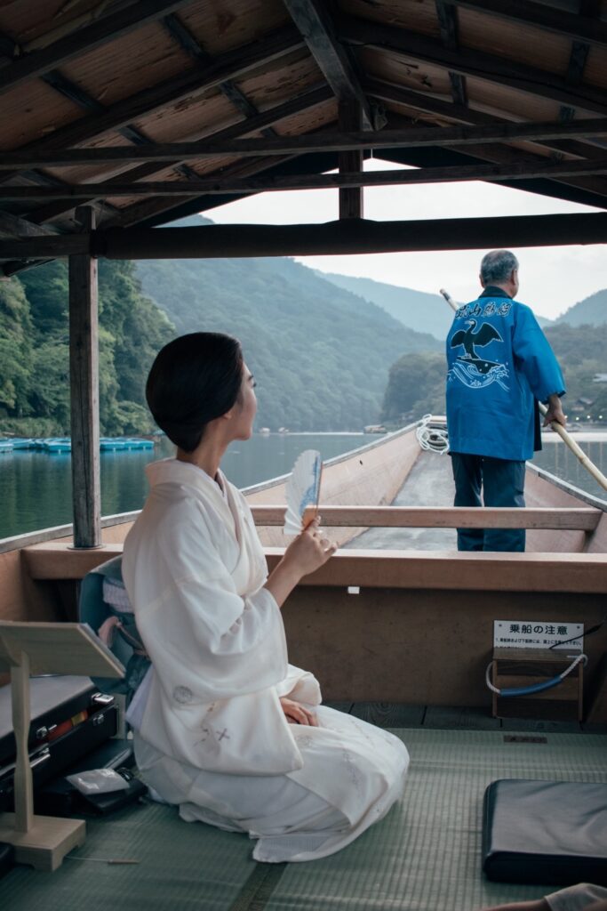 Adding to the charm, a small snack boat often drifts by, offering the chance to order refreshments just as aristocrats once did when they floated the Katsura River centuries ago. The scenery itself changes with the seasons—the cherry blossoms of spring, the lush greens of summer, the crimson maples of autumn, and the quiet beauty of winter mist—all mirrored in the flowing water. Kohaku’s kimono, carefully chosen for the season, enhances the sense of timeless elegance.