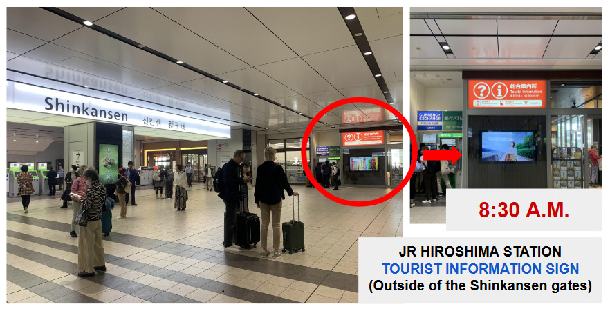 The tour begins with a meetup at Hiroshima Station at 8:30 AM. Your guide will meet you by the Shinkansen Gates under the Tourist Information sign.