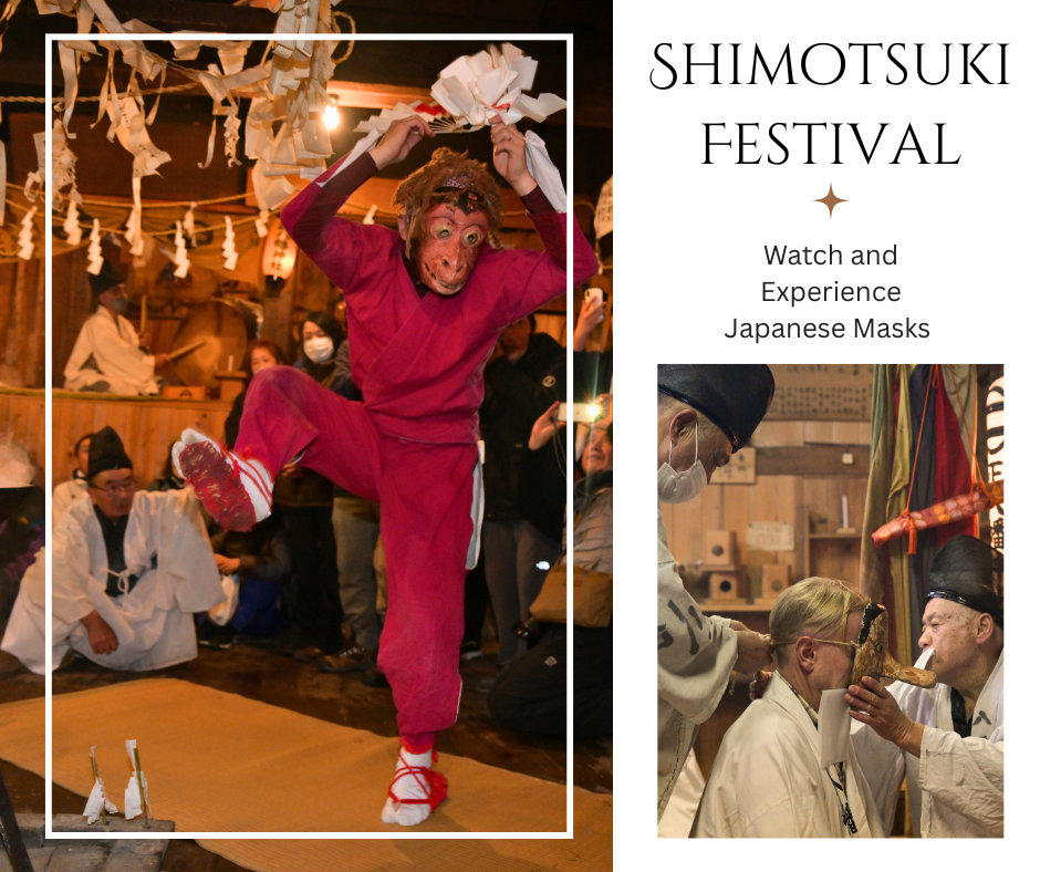 ‘Shimotsuki Matsuri’ is a very local, very unique festival that we’re sure you’ll enjoy. You will attend the festival twice on the first day of the tour. On the first visit in the early afternoon, you’ll meet the community and your guide will explain the underpinnings of the festival and what you will witness later that night. After your dinner, you will return to the festival to the enjoy the climax in which time performers dance inside a small shrine full of local residents. Performers dance around a cauldron of hot water over a fire, using their bare hands to splash the water over the crowd as a form of purification. Residents then dress in traditional clothing and wear masks as they dance around the cauldron and for the entertainment of onlookers. Male guests can also wear a mask and dance – something you are not obliged to do but something we encourage you to try. This tradition is reserved for men and we ask that you respect that practice. The shrine is small and festival is raucous so expect to get splashed with water and be pulled into proceedings. It’s all part of the fun.
