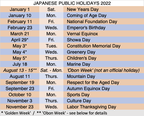 Japan observes the following public holidays each year with three periods during which many Japan take extended leave – ‘O-Shogatsu’ over the New Year period, ‘Golden Week’ in late-April to early-May, and ‘Obon Week’ in August and – see below for further information.