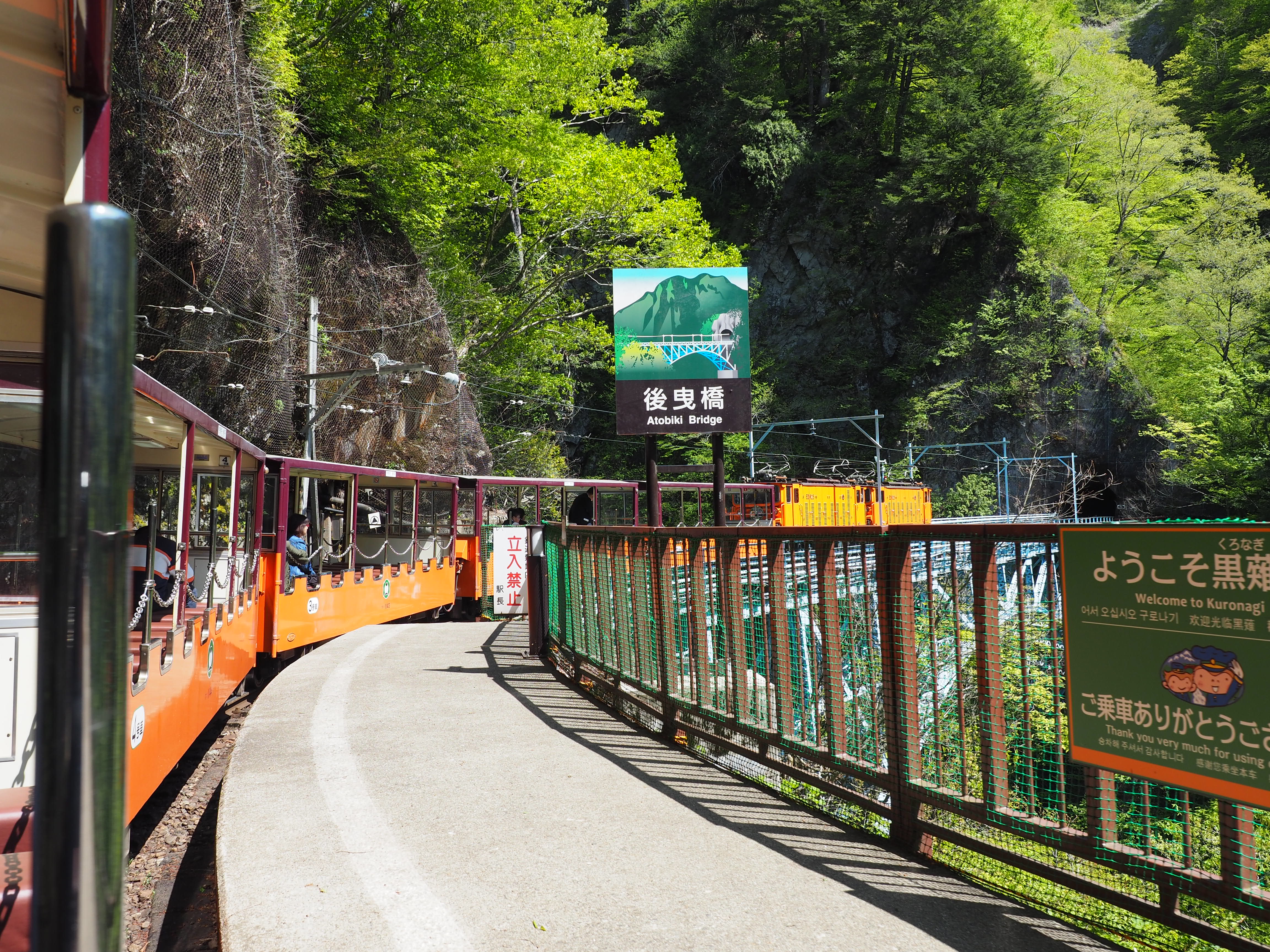 从平台出发,沿着楼梯下降到河边,那里有一条步行道通向露天的黑薙温泉和著名的古老渡槽景观。该地区还有一家宾馆。列车一出站,就立即穿过後曳桥。这座桥长 64 米,高 60 米,横跨整个黑部峡谷最深的峡谷。