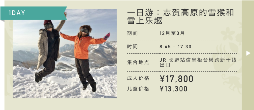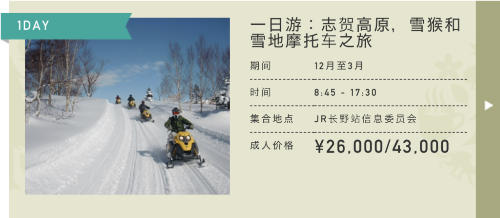 对于冬季前来的客人,我们还提供“志贺高原雪猴与雪上乐趣一日游”配套,将雪橇、雪地摩托等刺激的雪上活动与雪猴公园之旅完美结合。套餐包含午餐,是想要体验长野冬季魅力的游客的完美一日游!