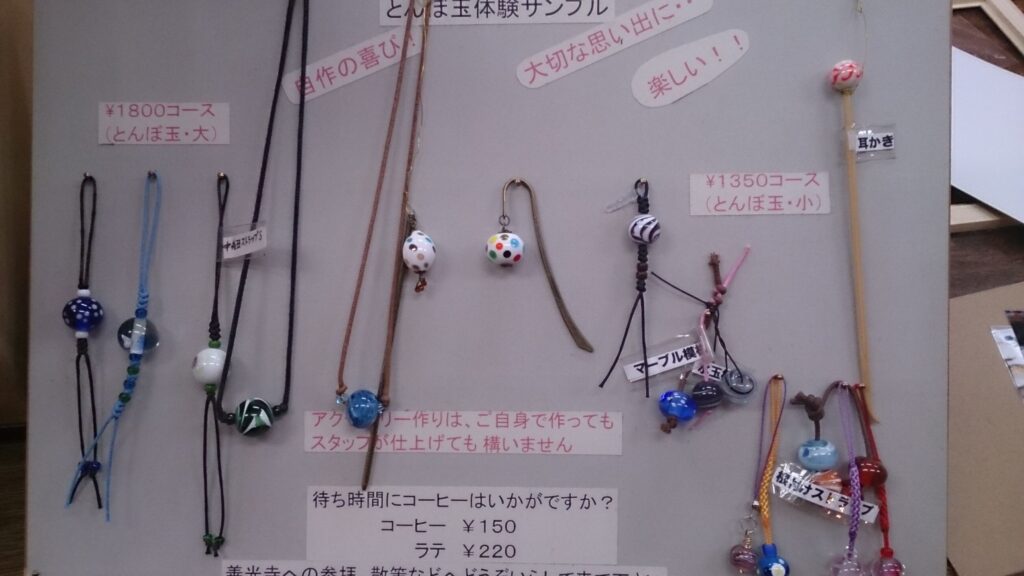 在艺廊花藏(Gallery Shop Hanagura),可以用不同的颜色和图案制作自己独特的蜻蛉珠。然后,可以用蜻蛉珠制作一个漂亮的项链或手提包。可以选择制作大小的玻璃珠,大的珠子的价钱较贵。需要大约2小时才能完成。