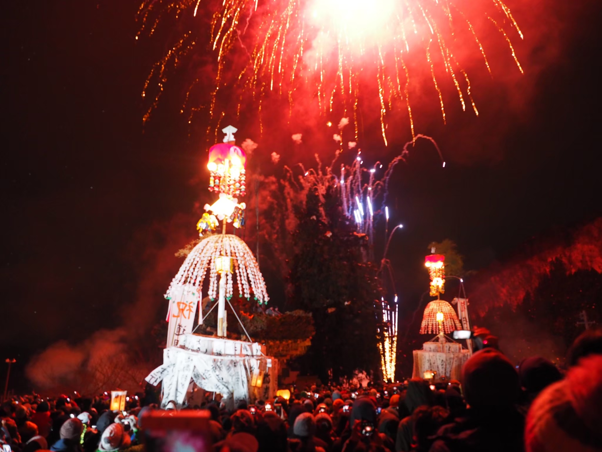 准备工作完成后,主要活动在15日晚7点左右开始,当地25岁的男子举着燃烧的火把在村子里游行,前往攻击神庙。8:30左右,他们将到达神社,并以真正的力量进行攻击,42岁的男子站在神社的顶部试图保卫它。在豪言壮语、人群的能量和大量 "清酒 "的推动下,攻防战以真正的激情展开--在寒冷的冬夜里,这是一个令人惊讶和喧闹的景象。最后,年长的男子会认输,从神龛上下来,然后在晚上10点左右点燃神龛,随着当地人把从自己家里带来的燃料扔到火上,神龛一直燃烧到深夜。你会看到各种各样的东西被扔进火里,因为他们烧掉了所有的坏运气,并祝愿来年有个好兆头,村庄继续成功。