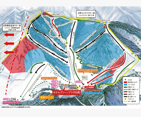 白马八方尾根滑雪度假村 -- ABLE白马竜滑雪场 -- 白马47冬季运动公园 -- 白马岩岳雪场 -- 栂池高原雪场 -- 白马CORTINA雪场 -- 白马乗鞍温泉雪场